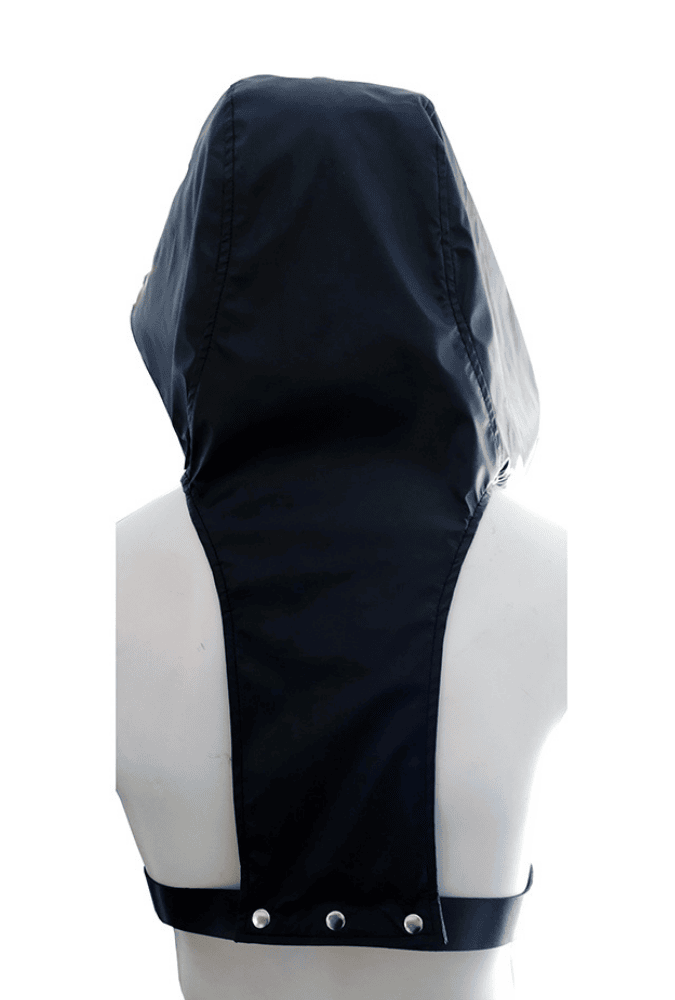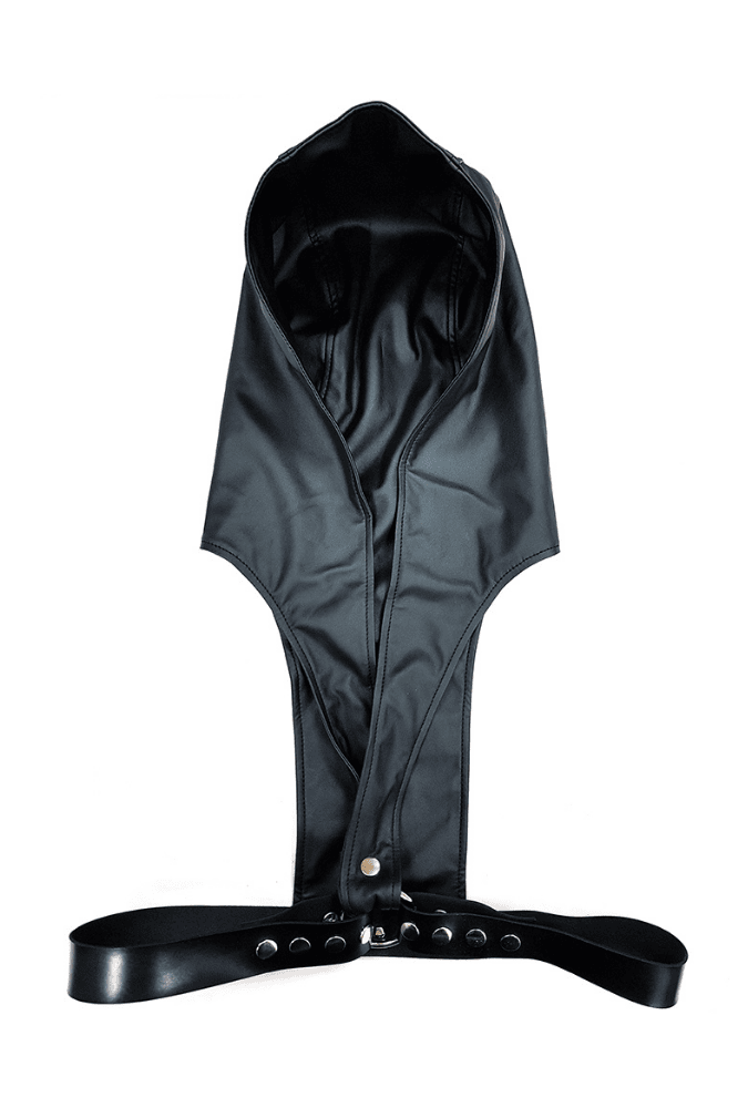 Les anneaux métalliques disposés sur le torse et les épaules permettent d’attacher cordes, menottes ou laisses, tandis que la capuche plonge le partenaire dans un état de soumission visuelle et auditive partielle, amplifiant chaque sensation.