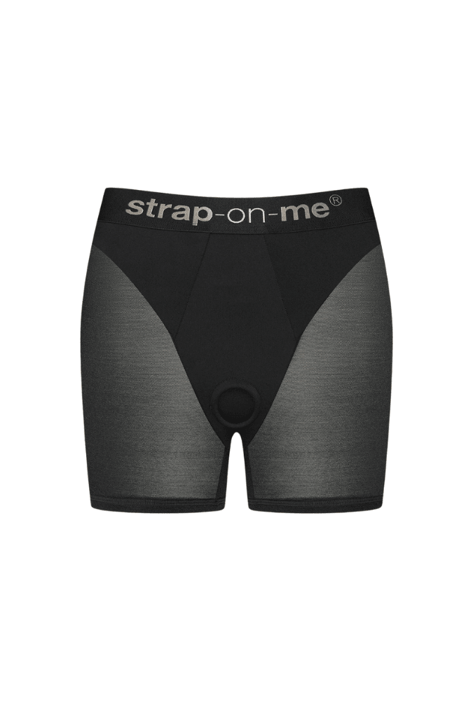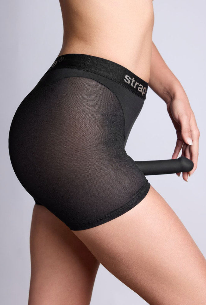 • Harnais cycliste hybride : mélange tulle/microfibre seconde peau avec anneau extensible discret pour accueillir un dildo compatible.