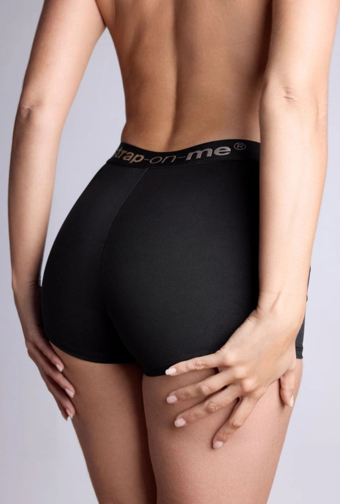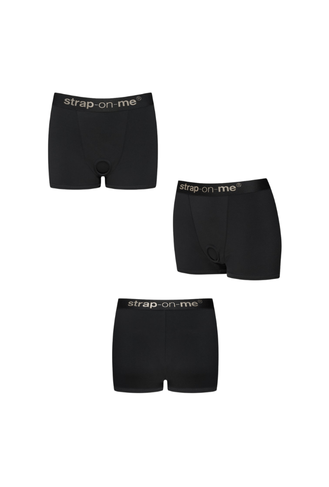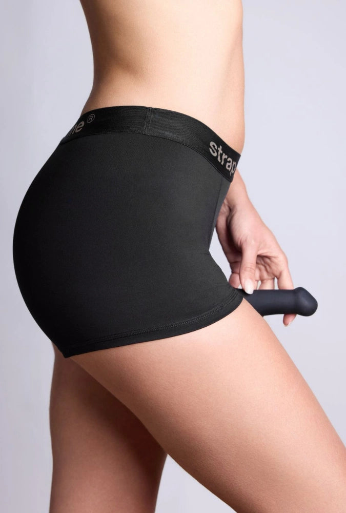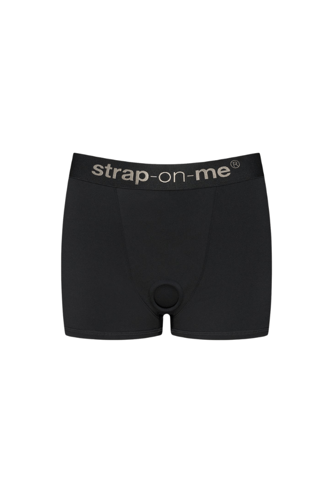 • Harnais boxer minimaliste : une coupe épurée qui allie confort, design neutre et anneau extensible discret pour accueillir le dildo de votre choix.